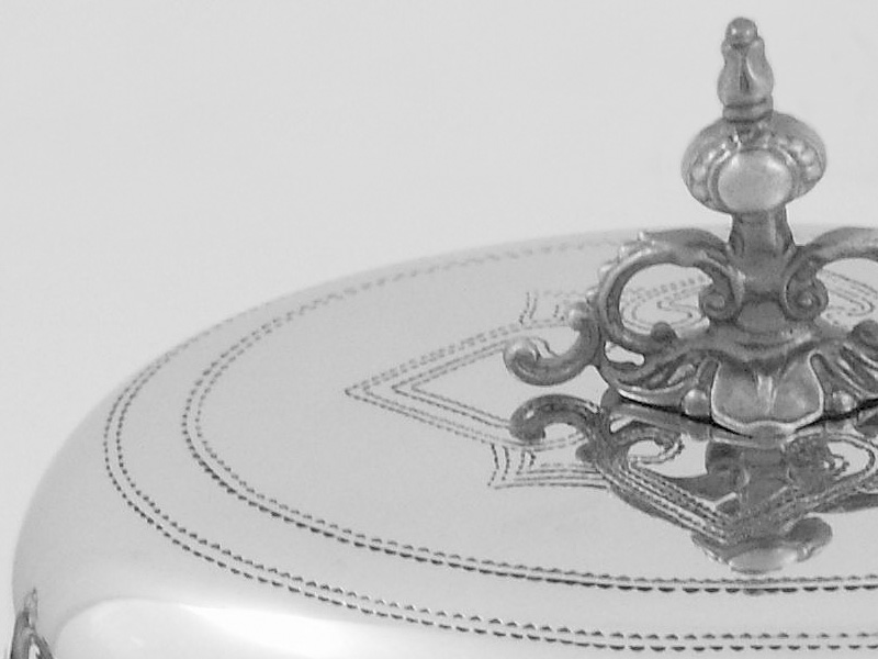 Cukiernica Fraget w całości wykonana jest ze srebra próby 925, charakteryzuje się trwałością i czystością. Dostępna jest w dwóch wersjach wykonania – oksydowana (na zdjęciu) oraz w połysku. Cena: 4690 zł (cena srebrnej cukiernicy oksydowanej i w połysku). Platerowana: 699 zł; 749 zł (oksydowana)
