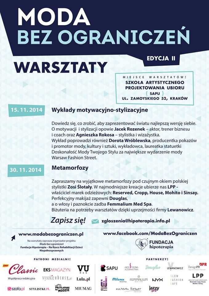 15 listopada w SAPU (Szkoła Artystycznego Projektowania Ubioru) przy ul. Zamoyskiego 52 w Krakowie odbędą się kolejne warsztaty w ramach II edycji wydarzenia „Moda bez Ograniczeń”. Motywacją i stylizacją zajmą się: Jacek Rozenek, Dorota Wróblewska i Agnieszka Rokosa
