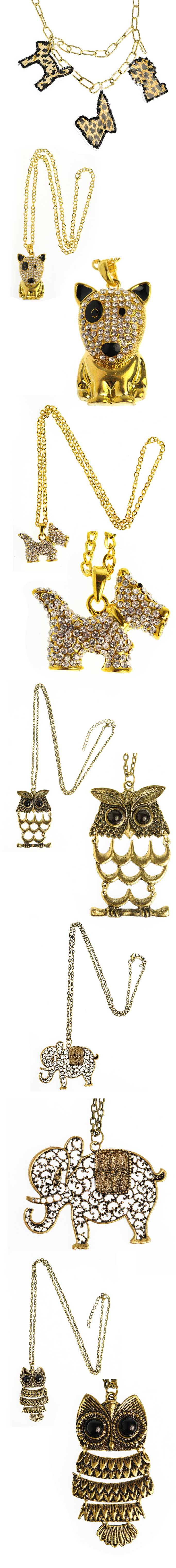 Motywem przewodnim są wizerunki zwierząt: sów, słoni oraz zabawnych piesków. Naszyjniki wykonane są z metalu w kolorze starego złota i srebra. Nadają się na każdą porę dnia do codziennych stylizacji inspirowanych Indiami czy amerykańską prerią. Idealne do łączenia z miękkimi bawełnianymi bluzkami w kratę, jeansem lub też z maksi sukienkami i spódnicami w stylu lat 70’.