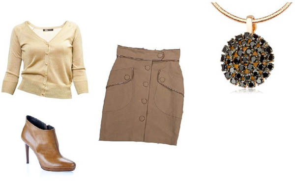 Spódnica w militarnym stylu w kolorze kawy z mlekiem z dużymi guzikami jest idealna dla każdej sylwetki- ołówkowy krój jest bardzo kobiecy. Kardigan ze złotym połyskiem można nosić teraz nawet do codziennych zestawów- niekoniecznie tylko na imprezy! Bogaty naszyjnik doda smaku, a botki sprawdzą się w czasie jesiennej słoty.
