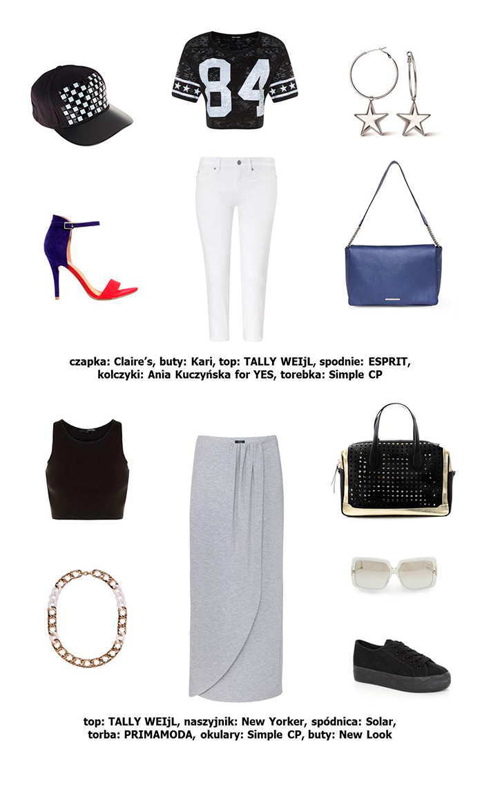Przepiękna spódnica i ten delikatny topik po lewej. Obie propozycje bardzo ładnie dobrane, ale jednak, mojemu stylowi jest bliższa ta dolna alternatywa. Mało kiedy się ubieram na sportowo, chyba że na siłownię, ale to wiadomo – dla wygody.